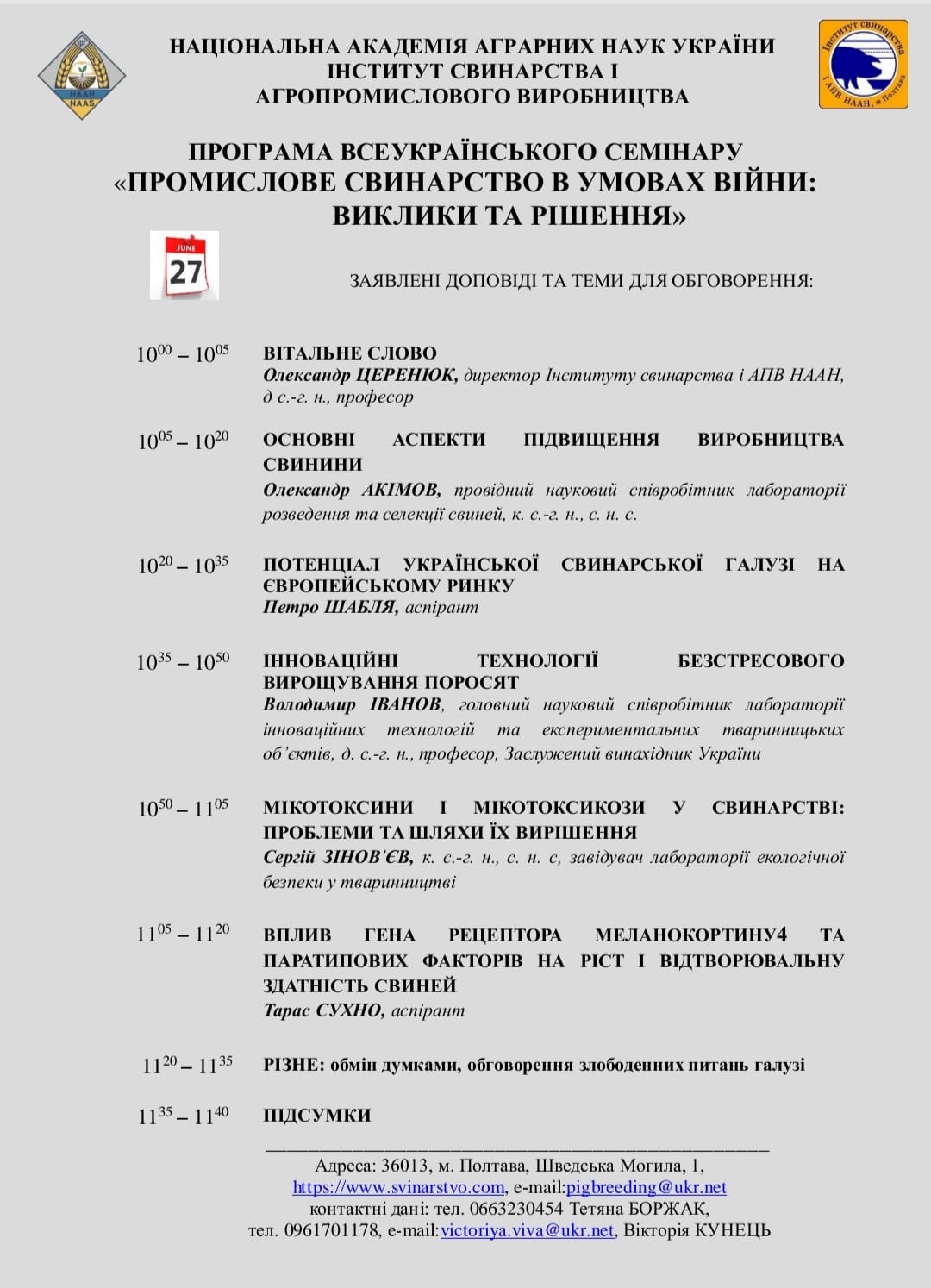 Шановні колеги! Запрошуємо вас взяти участь у Всеукраїнському семінарі «ПРОМИСЛОВЕ СВИНАРСТВО В УМОВАХ ВІЙНИ: ВИКЛИКИ ТА РІШЕННЯ», який відбудеться 27 червня 2024 р. о 10.00 годині (за київським часом). Більш детальна інформація у запрошенні та програмі заходу.