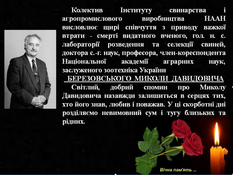З глибокою скорботою повідомляємо, що 21 квітня 2023 року на 86-му році життя пішов у засвіти видатний вчений-селекціонер, доктор сільськогосподарських наук, професор, член-кореспондент НААН, заслужений зоотехнік України — МИКОЛА ДАВИДОВИЧ БЕРЕЗОВСЬКИЙ.